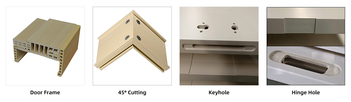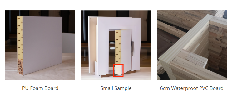 Door Leaf: 0.16 mm PVC film + 2 mm WPC door skin + wood skeleton + infilling + waterproof PVC board